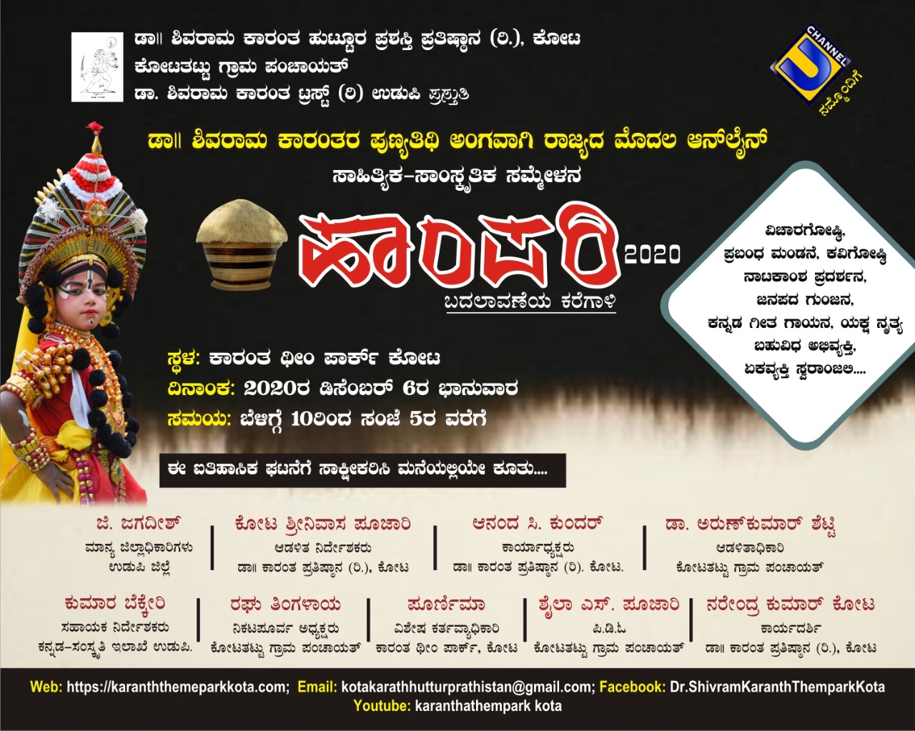 ಕೋಟ : ಡಾ|| ಶಿವರಾಮ ಕಾರಂತ ಪ್ರತಿಷ್ಠಾನ(ರಿ)ಕೋಟ, ಕೋಟತಟ್ಟು ಗ್ರಾಮ ಪಂಚಾಯತ್, ಡಾ|| ಶಿವರಾಮ ಕಾರಂತ ಟ್ರಸ್ಟ್ (ರಿ) ಉಡುಪಿ ಇವರ ಸಹಯೋಗದಲ್ಲಿ ಡಾ|| ಶಿವರಾಮ ಕಾರಂತರ ಪುಣ್ಯತಿಥಿ ಅಂಗವಾಗಿ ರಾಜ್ಯದ ಮೊದಲ ಆನ್ ಲೈನ್ ಸಾಹಿತ್ಯಿಕ-ಸಾಂಸ್ಕೃತಿಕ ಸಮ್ಮೇಳನ ಹಾಂಪರಿ-2020 (ಬದಲಾವಣೆಯ ಕರೆಗಾಳಿ ) ಕೋಟದ ಕಾರಂತ ಥೀಮ್ಪಾರ್ಕ್ ನಲ್ಲಿ ಡಿಸೆಂಬರ್ 6 ರ ಭಾನುವಾರ ಬೆಳಿಗ್ಗೆ 10 ರಿಂದ ಸಂಜೆ 5ರ ತನಕ ನಡೆಯಲಿದೆ. ವಿಚಾರಗೋಷ್ಠಿ, ಪ್ರಬಂಧ ಮಂಡನೆ, ಕವಿಗೋಷ್ಠಿ, ನಾಟಕಾಂಶ ಪ್ರದರ್ಶನ, ಜನಪದ ಗುಂಜನ, ಕನ್ನಡ ಗೀತ ಗಾಯನ, ಯಕ್ಷನೃತ್ಯ, ಬಹುವಿಧ ಅಭಿವ್ಯಕ್ತಿ, ಏಕವ್ಯಕ್ತಿ ಸ್ವರಾಂಜಲಿ ಕಾರ್ಯಕ್ರಮಗಳು ನಡೆಯಲಿದೆ ಎಂದು ಡಾ|| ಕಾರಂತ ಪ್ರತಿಷ್ಠಾನದ ಕಾಯರ್ಾಧ್ಯಕ್ಷ ಶ್ರೀ ಆನಂದ ಸಿ ಕುಂದರ್, ಕೋಟತಟ್ಟು ಗ್ರಾಮ ಪಂಚಾಯತ್ ಆಡಳಿತಾಧಿಕಾರಿಡಾ.ಅರುಣ್ ಕುಮಾರ್ ಶೆಟ್ಟಿ, ಥೀಮ್ ಪಾರ್ಕ್ ನ ವಿಶೇಷಕರ್ತವ್ಯಾಧಿಕಾರಿ ಶ್ರೀಮತಿ ಪೂರ್ಣಿಮಾ, ಕೋಟತಟ್ಟು ಗ್ರಾಮ ಪಂಚಾಯತ್ ಪಿ.ಡಿ.ಓ ಶ್ರೀಮತಿ ಶೈಲಾ ಎಸ್ ಪೂಜಾರಿ ಅವರು ಪ್ರಕಟಣೆಯಲ್ಲಿ ತಿಳಿಸಿದ್ದಾರೆ.